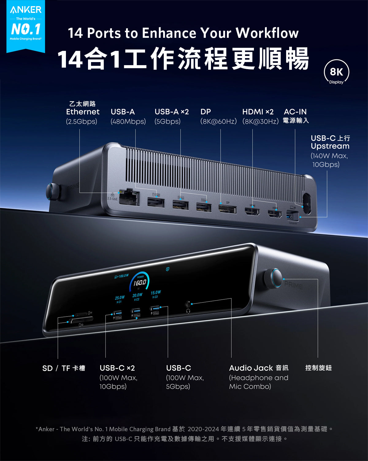 Anker Prime 擴充座 14 合 1 140W PD (A83B32A1) | 三螢幕顯示:2 個 HDMI + 1 個 DisplayPort 介面