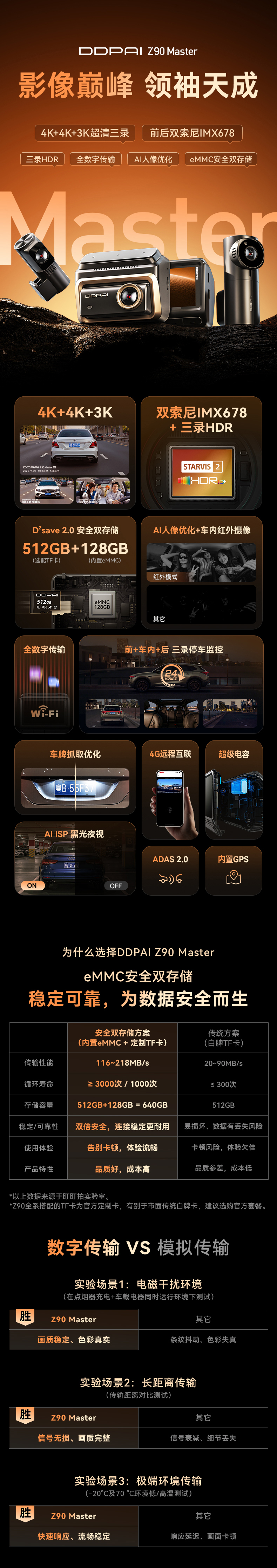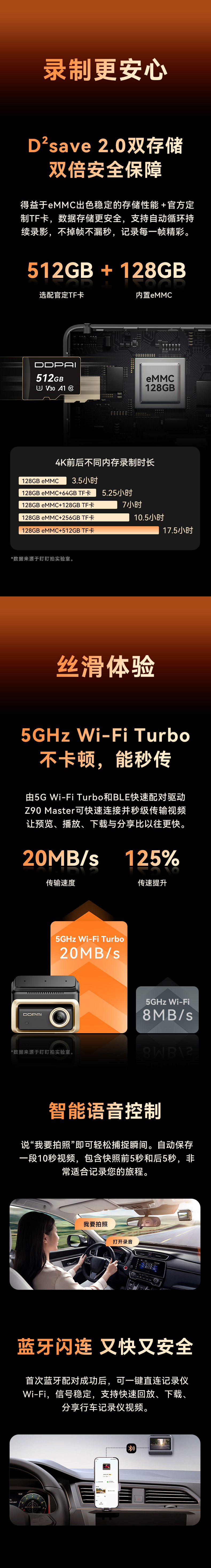 雙儲存系統 (D²save 2.0):內置 128GB eMMC 快閃記憶體,並支援最高 512GB MicroSD 卡,當記憶卡損壞時,內置儲存可作備份,確保錄影不中斷。