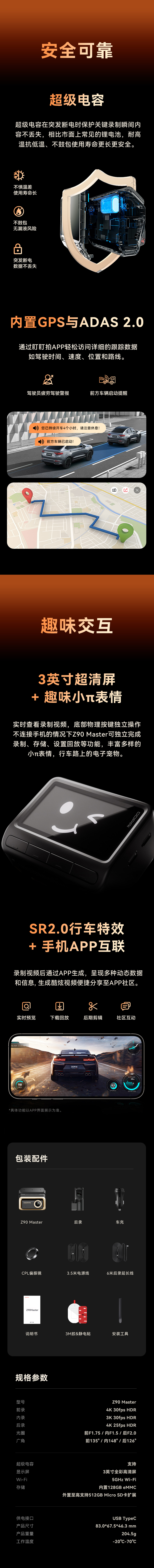 連接性與智能功能: 內建 5GHz Wi-Fi 實現快速影片傳輸,支援 4G 連接(需選購 4G 模組)以實現遠端即時查看和推播通知,並具有 GPS 和 ADAS 2.0 駕駛輔助警報。