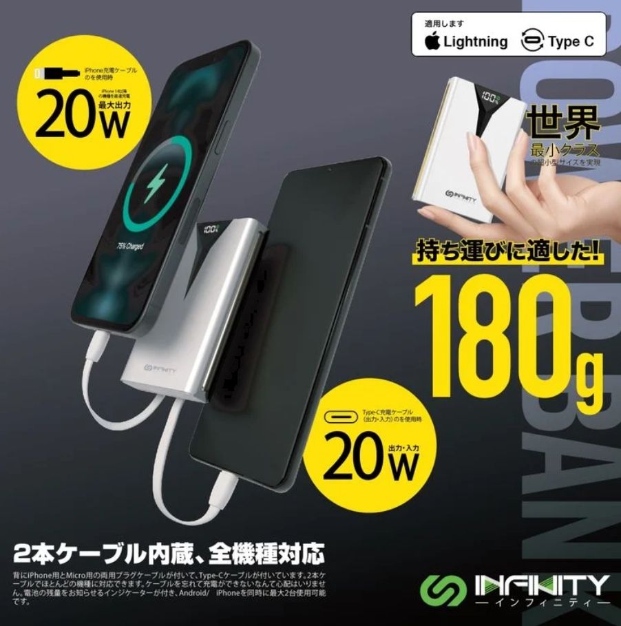 -自帶線TYPE-C及iPhone線支持PD20W快充(TypeC線可入力&出力)